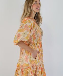 No one could resist admiring a cutie like you in the Live Life In Full Bloom Orange Floral Mini Dress! Featuring a vibrant orange hue with a charming floral print, this mini dress is designed with a stretchy smocked bodice that hugs in all the right places and flows into a breezy, flared skirt. The lightweight fabric and playful silhouette make it perfect for brunch dates, beach getaways, or twirling through the weekend in style! Lightweight Woven Knit Fabrication Floral Print Scoop Neckline Smocked Bust with Functional Button Front 3/4 Length Balloon Sleeves with Elastic Cuffs Elastic Waistband Flowy Fit Ruffle Hem Side Pockets Open Back with Elastic Strap Detail Short/Mini Length Lined Skirt Self + Lining: 100% Polyester Machine Wash Cold, Tumble Dry Low Models are 5’0″ + 5’9.5″ and are wearing a Small.Garment Measurements in Inches:Small | Bust 30″ (Stretches up to 34″) | Waist 26″ (Stretches up to 30″) | Hips 58″ | Length 34″Medium | Bust 32″ (Stretches up to 36″) | Waist 28″ (Stretches up to 32″) | Hips 60″ | Length 34.5″Large | Bust 34″ (Stretches up to 38″) | Waist 30″ (Stretches up to 34″) | Hips 62″ | Length 35″